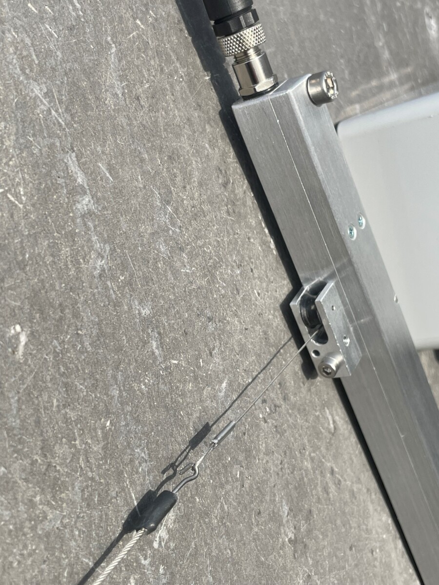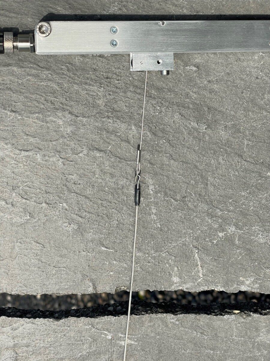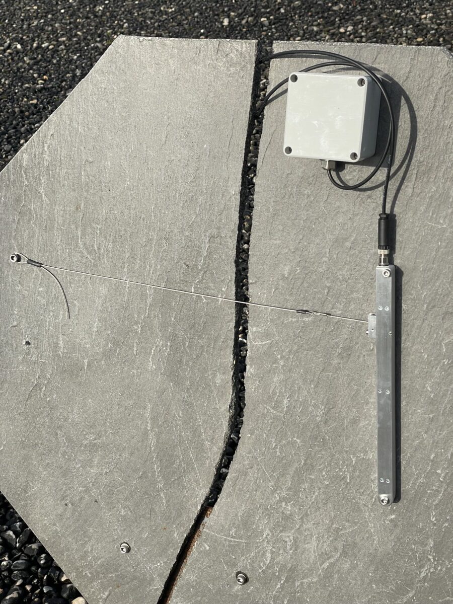 Suivi des mouvements de blocs rocheux et glissements de terrain. - Fonctionnement : Capteur vissé sur un point fixe avec un câble attaché au point mobile.